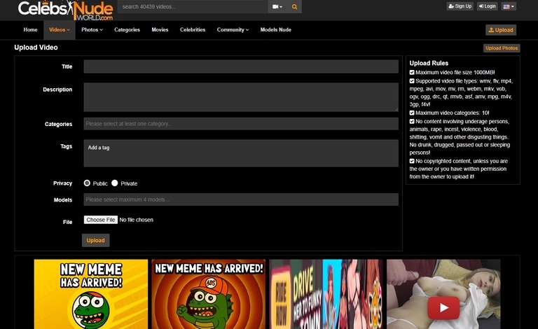 Celebsnudeworld has rules. You can’t post anything illegal or anything that isn’t yours. There are also rules about how big your video can be. You can’t upload anything bigger than 1GB. If your video is too big, shrink it or save some parts for your own site. You can also only use certain file types. MP4, WMV, MOV, and others work best.